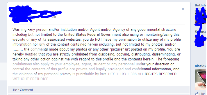 lol i bet someone thought they were super smart when they discovered privacy laws, but neglected to realize that laws are never written to mean what they say snopes.com: Facebook Privacy Notice